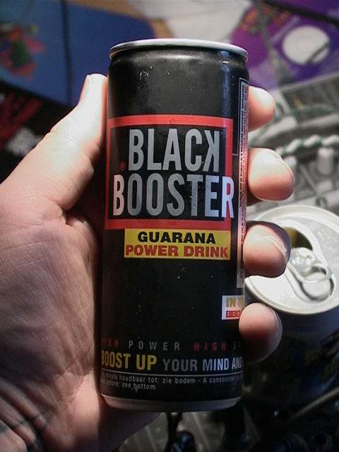 Just got back from my walk, and on the way ran into my old friend Emma (note: VERY old picture) which was nice… The film will be back at noon so I'll have time to do work first, after I drink this Black Booster… It's a mild-cola with a guarana aftertaste. It's alright, but XTC is still the best one in my books.