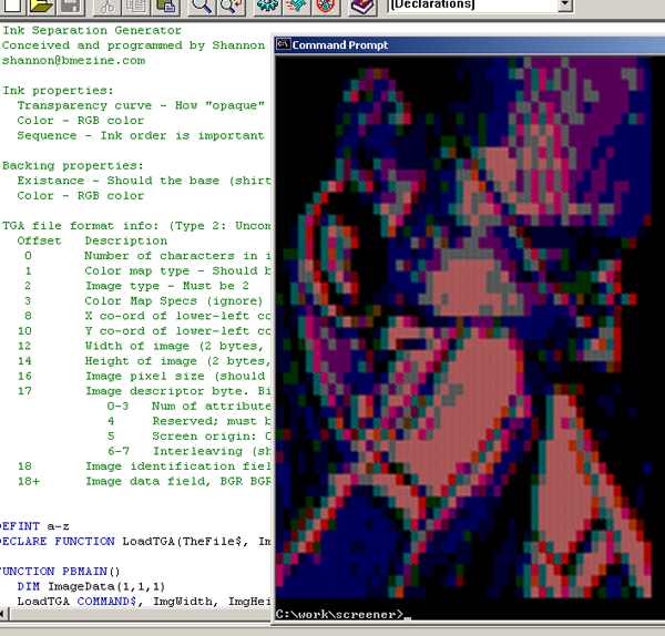 The intricacies are actually kind of interesting. Seriously, given an input color at a specific pixel location, and a list of inks and a base shirt color, how much of each ink do you need to screen, and in what order, to match it as closely as possible? Keep in mind that we're not talking about CMYK mixing which any idiot can do in their sleep. It might be two blue inks and a red ink on a black shirt. Added to that, the inks are opaque, making order very important. Added to THAT, silk screening is somewhat inaccurate and you have to take into account that because of the opaque overlaps, different levels of saturation will effectively have different levels of artificial transparency (because a high saturation will obscure more even if it's not properly aligned). I can think of the way to do this slowly ink picking through a trial-and-error process, sped up by a look-up table, but if there are any bright people out there that can tell me a quick algorythm, I'd love to hear it. I've gotten as far as thinking about it a lot and defining all the parameters, and writing the routines for doing the basics like reading and writing TGA files (a wonderfully simple image format).