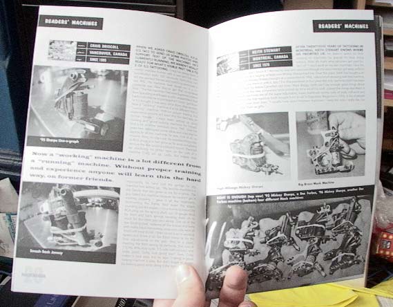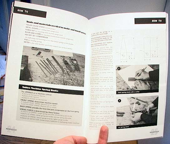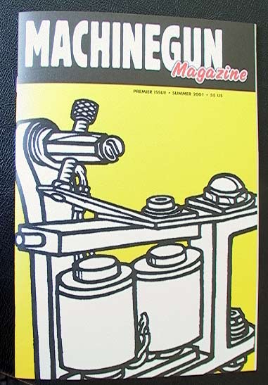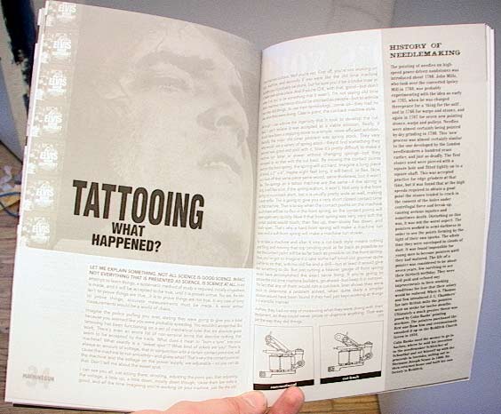 Just got this today — the premier issue of a tattoo trade journal. I've never seen anything like it… Features include a wild project machine and reader's machines (which reminds me an awful lot of custom car magazines!), an interview with Seth Ciferri on tattooing and machine building and his website, a how to article on cutting springs, a shop space feature on the prevention of cross-contamination in tattooing, articles on the evolution of the tattoo machine and the history of needlemaking, tons of technical questions answered, and even fun stuff like a coloring contest and an autoclave cookbook.