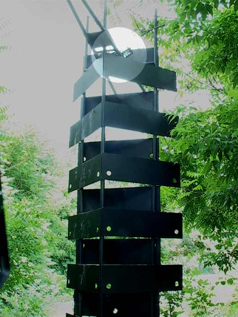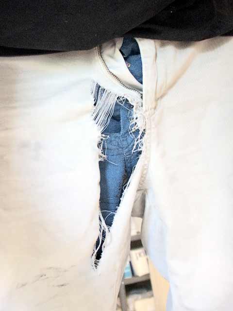 HOWEVER. I did it with a hardship — the steps are pretty big, even for a tall guy like me. I noticed as I climbed, my zipper started opening. Then on the next step, the crotch of my pants tore. Each step I took, the rip got bigger. My boxer shorts didn't do much to cover me, but I figured that I'm standing in front of an empty lot amid some trees, so what do I care. As luck would have it, the guys on the construction crew that partks their vehicles in the lot next door were just getting off, and checked out what I was doing. I sure hope the bizarre tower distracted them from the fact that my cock was waving in the wind…