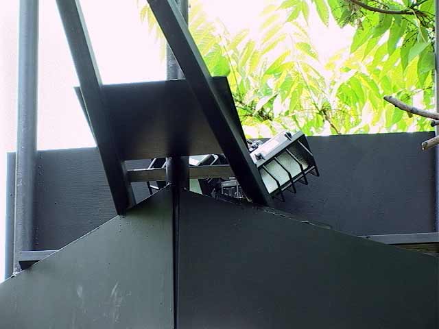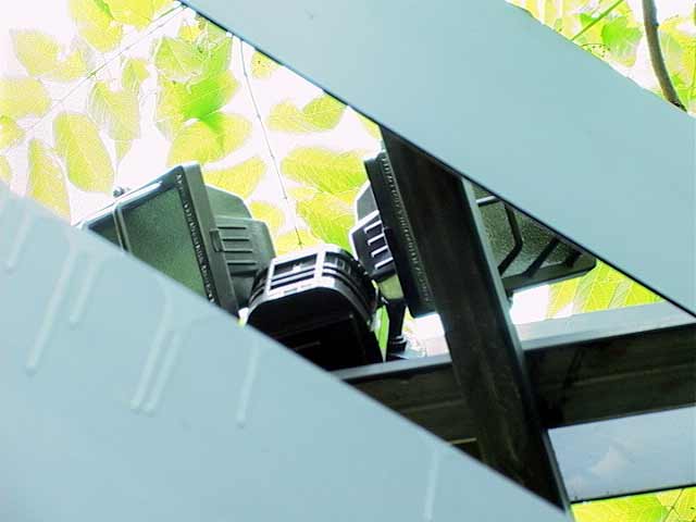 The lighting grid is up. Enormous — and I mean ENORMOUS — respect must go out to the three brave warriors who actually built the tower. All I had to do was climb up the top with a drill and the lights and assemble it up there. Now, that's not really easy to do by yourself since there were many times I wasn't holding on at all — stupid I know… I'm totally winded and sweating like a pig, but what I did was nothing in comparison to what they achieved!