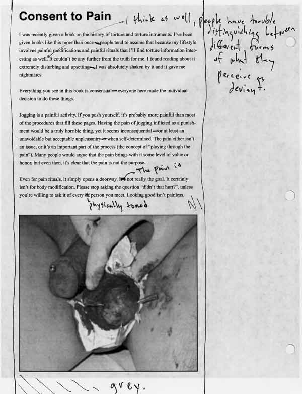 I was flipping through “Rack Rope And Red-Hot Pinchers: A History of Torture and It's Instruments” by Geoffrey Abbott (Headline Book Publishing, 1993) and came across the following reference to what is, I suppose, an incredibly early reference to a Madison piercing: