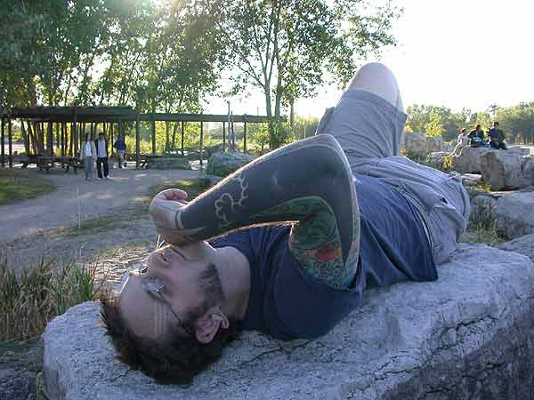 I told Shane and Amanda all about our earthship building plans, and coincidentally a friend of Amanda's was there who'd just returned from BC where he'd helped build a straw bale house… And he had lots of pictures of it with him! Anyway, on to the tattooing. We didn't do much; we just designed and quickly outlined the shoulder cap: