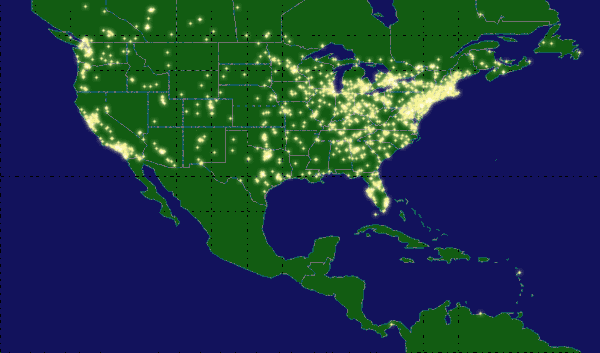 OK, I wanted to test to see if rather than scaling onto a world map, I could draw the output onto a North American map (or any map where I know the latitude and longitude of the corner points). Anyway, I'm done with this for now, but on the new server I'll make toys like this live (so for example, you'll be able to see a map like this, but it'll only show users who are currently online). Anyway, click below for another: