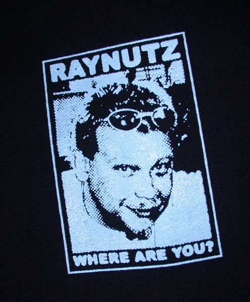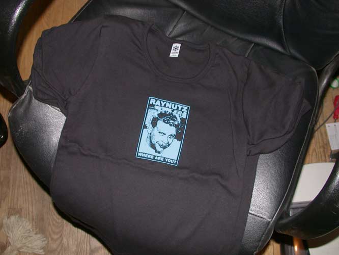 I'm getting the prizes together for the “I Bet You Will“-style game. So far I have the Raynutz shirts (see below), a couple of JMEAT+FRNX DVDs (JMEAT is a video of various urethral play and subincision procedures, and FRNX is a guy/guy sounding video which also includes footage of a man's stretched frenum being sexually penetrated by another man), a widescreen DVD of the last BBQ, a couple DVDs of older BBQ footage, some of the ORIGINAL stickers (the round silver ones), some packs of trading cards, and some IAM music CDs.