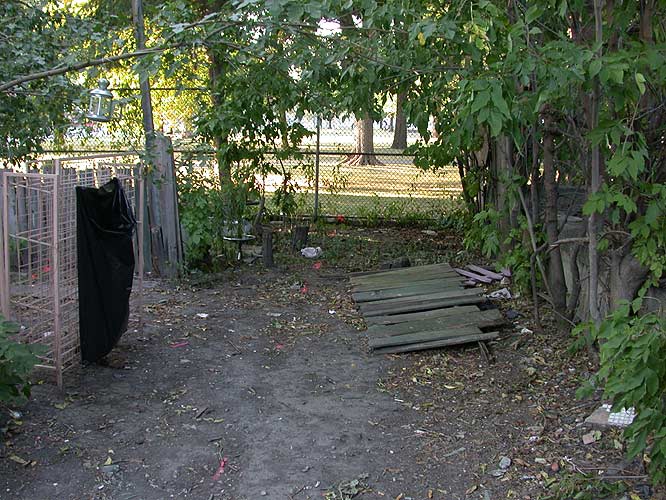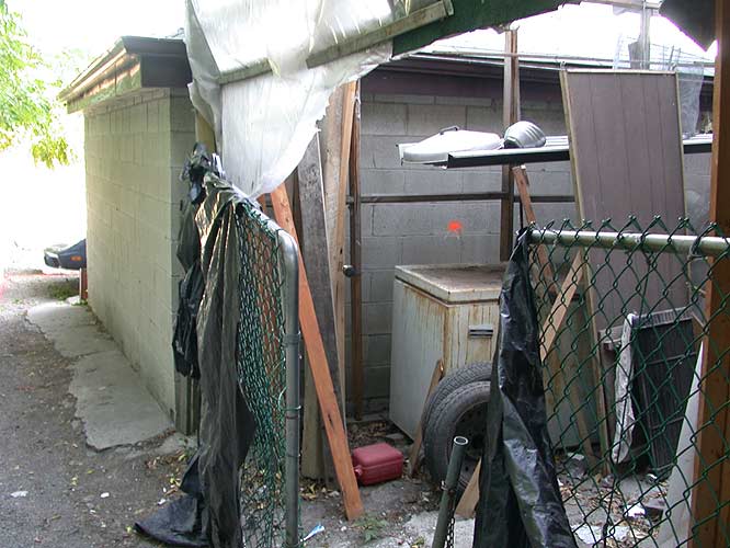 Here are some more pictures — you can see that they went into my neighbor's garage (trespassing I guess) and spray painted their property line on the wall (yes, they're ten years old). You can also see where they knocked down the hippies' fence and sprayed their garden. Kooky stuff.