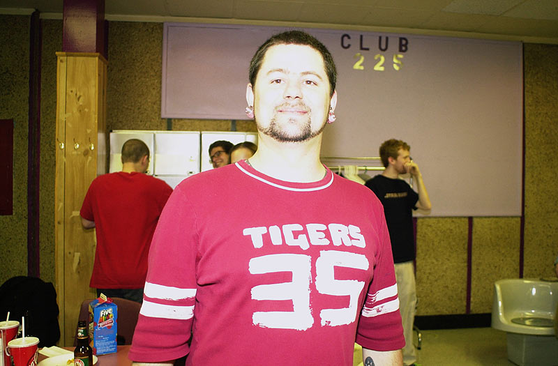 * Wearing: Olive pants, one white sock and one black one, boxers with numbers on them, and an old TEAM BME shirt with bleach stains on it.