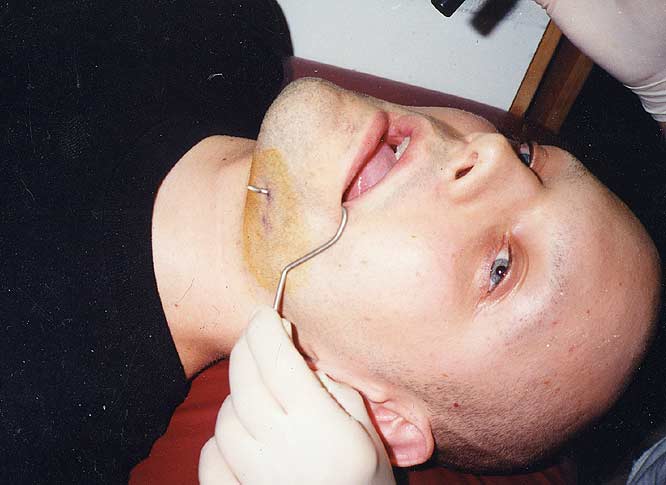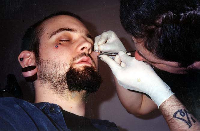 Getting anti-eyebrows done using a pair of custom titanium surface bars (made by me). |