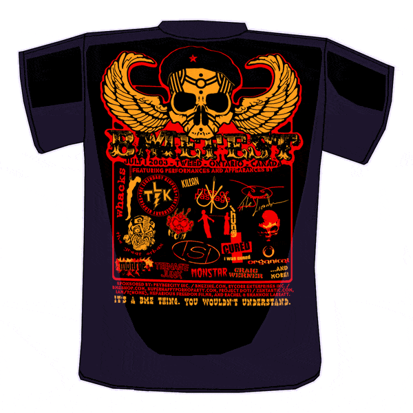 Oh, and yes, the print really is that big on the back — it totally fills the back. There are going to be two styles of front designs (I'll post those later today) to pick from, with both having this backing. The shirts will, with any luck, be $10 Canadian at the BBQ (about $7 US) assuming I can get a good price from the printers; they're 4-colour double sided prints.