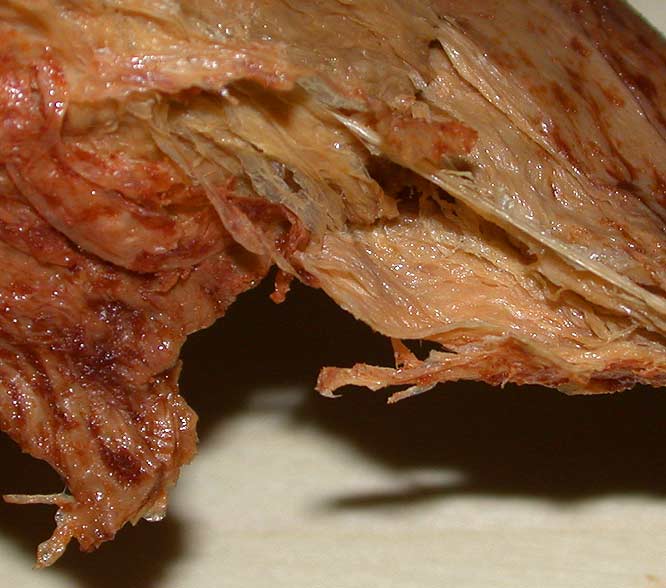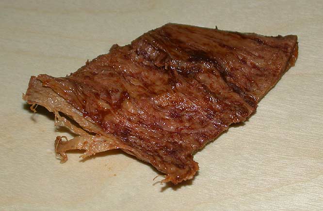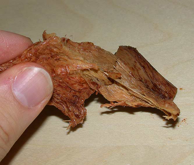 On the whole I prefer not to eat fake meats, but Rachel got me this 100% vegan “beef” jerky. Flavorwise it's nothing unusual, but texturally and visually it's quite freaky (it's some kind of spun vegetable protein or seomthing) so I wanted to post it. The pictures are kind of gross: