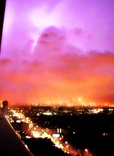 I just saw the most insane lightning storm here in Toronto. I went out on the balcony and it was incredibly near by — I watched it hitting the lake, not more than a few hundred feet out from shore. I stood on the balcony of our 27th story apartment and felt the electricity come closer and closer. Suddenly a bolt of lightning arced past in front of my face, less than fifty feet from me. I could feel the charge move past me, my nerves tingled, and the ear-shattering thunder instantly struck me. At that moment the sky opened up and a flood of water was on my cheeks — I was nearly expecting the Four Horsemen to ride out of the heavens at me. Below is a photo of the sky lit by lightning: