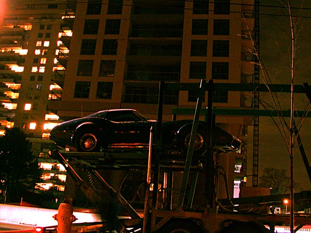 Well, the Corvette is on its way to its new home (Badur helped me with an emergency jumpstart). I'm very sad to see it go, but am hopeful that its new owner enjoys it as much as I have. For the curious, it wasn't sold, it was given away to a friend who's helped here a great deal behind the scenes. Left to right you can see first the rescue, then waiting for and loading onto the truck.