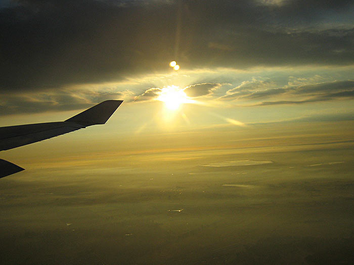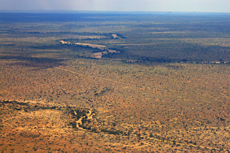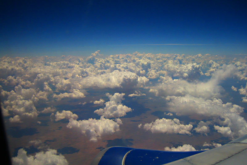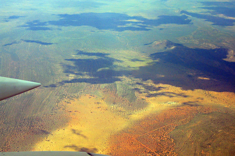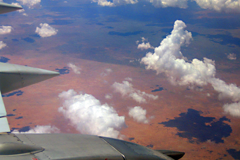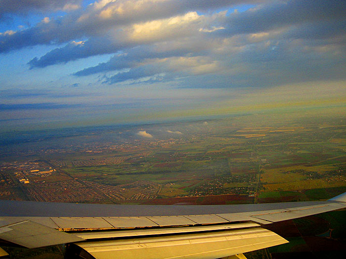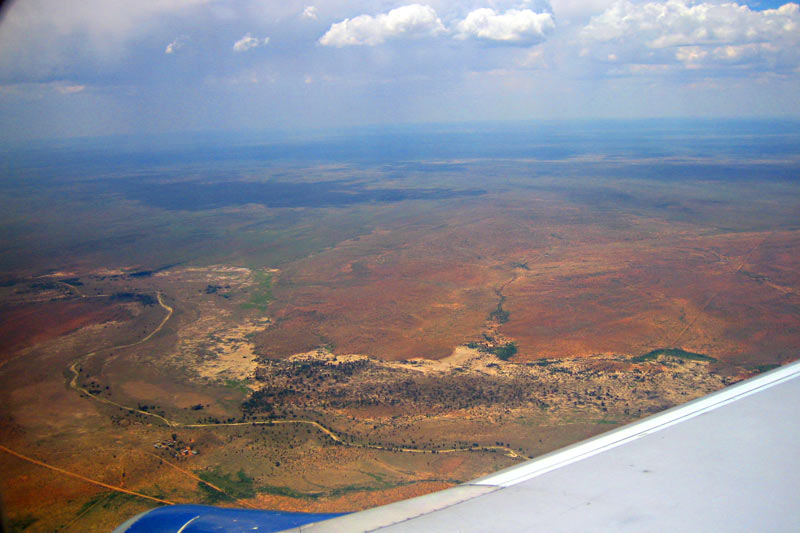 I'm writing this from a hotel in downtown Windhoek, Namibia. The flight, a short hour and a half or so on an almost deserted jet, took a path across Botswana and over the Kalahari desert. The weather was getting stormy, and it was some of the worst turbulence I've ever experienced on a full-size jet — I think the only time I've been tossed around like that is coming in for a landing at Toronto's City Centre airport in the small Cessna I flew during my pilot's training. However, the view was gorgeous.