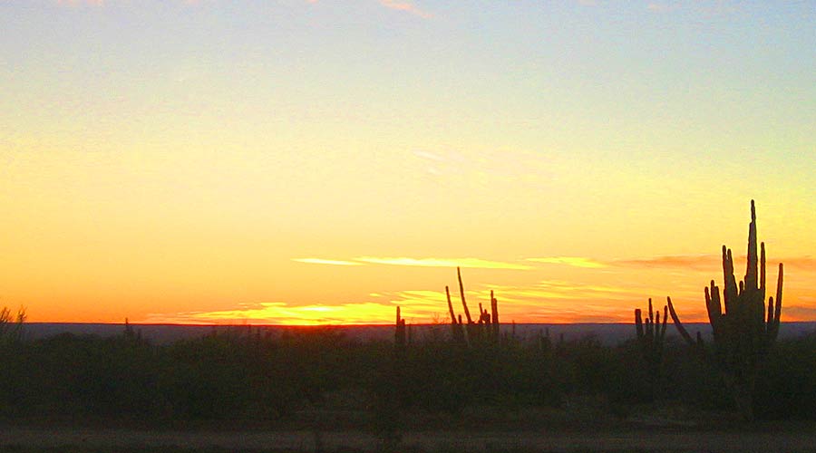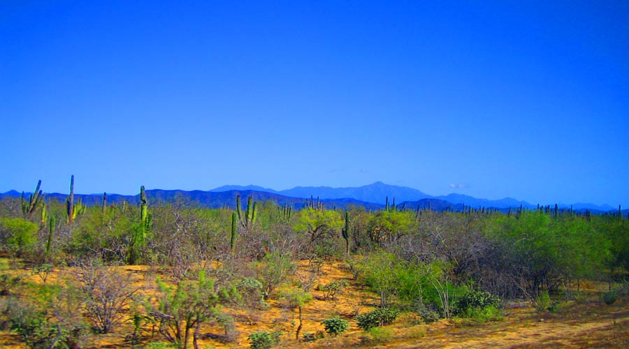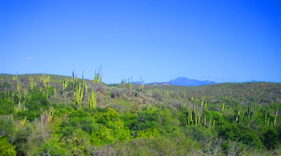 Most of the drive looks like this — cacti as far as the eye can see, desert shrubs, and rows of mountains in the background. |