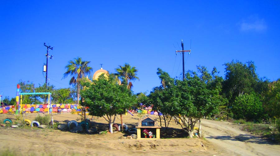 This is coming into the city of Todos Santos I think. The highway is dotted with small shrines for people killed in accidents. This one isn't, but many of them are constructed with the parts of the car that killed them. |