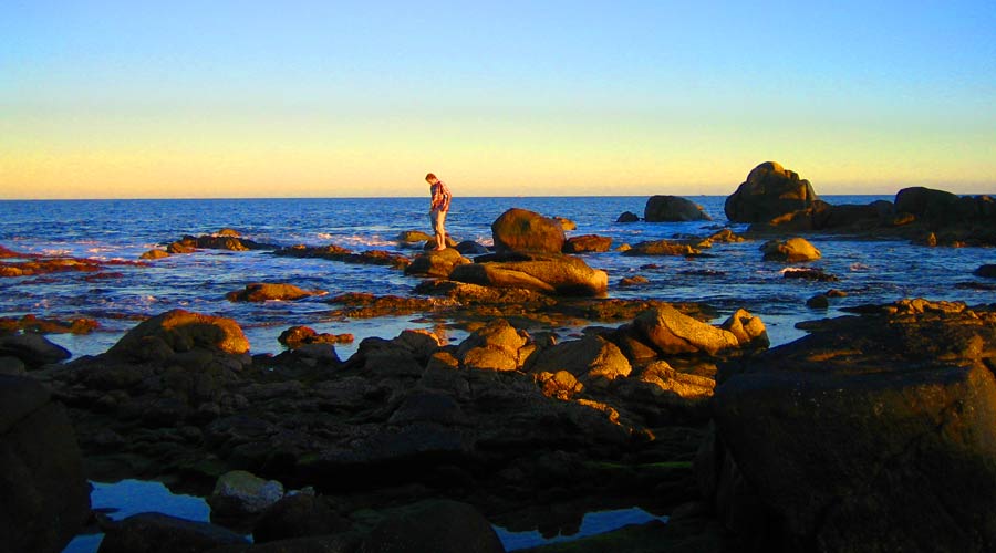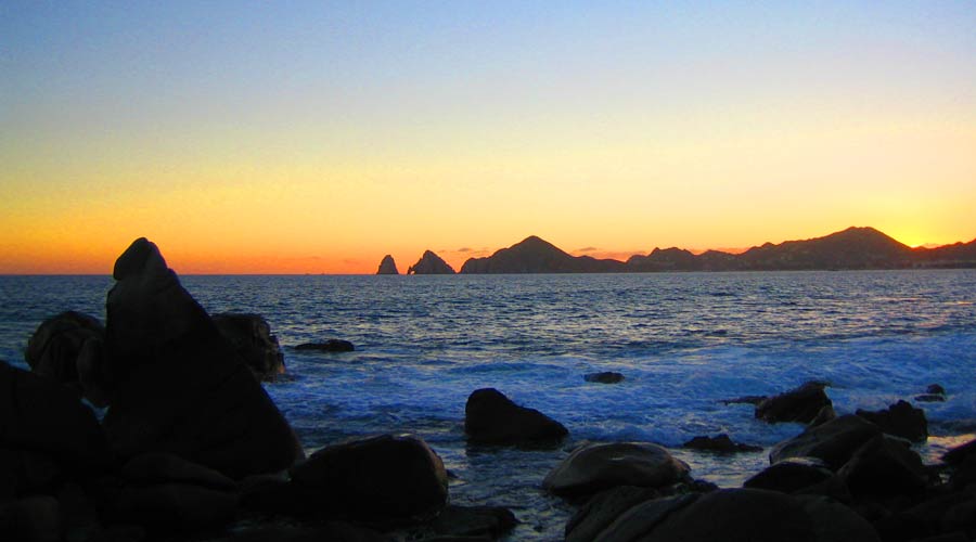 More of the beach in Cabo. This is one of the rocky parts of course; most of it is sand beach, but this is more fun to explore because it's more alive — fist size crabs are scampering all over these rocks.