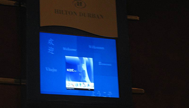 The left photo is their SuSE/KDE system booting up — a massive thunderstorm had taken their power grid out. I had to stand in line for quite a while with some unsavory