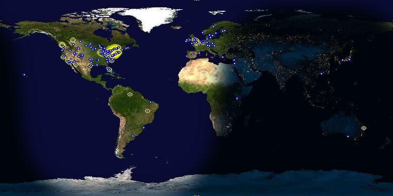 I made a little full-day animation of yesterday's use of IAM (it's about a three meg WMV file). Blue dots represent a user online at that instant, and a yellow glow of various sizes gets emitted depending on how many users are online in that location at that moment. You'll notice two or three users that have mis-entered their location as well (you can see below someone showing up in the Marquesas Islands, which I'm guessing is wishful thinking). Timecode is EST by the way: