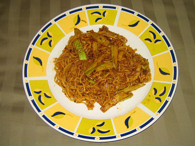 First, something pleasant. The dish below is just noodles (yeah, Ramen) and zucchini, but I wanted to experiment with another hot paste. This one is fresh ground chipotle chiles and almonds in about a 1:1 ratio, with a little garlic powder and brown sugar as well, with lemon for consistency. It's very sweet and spicy with a nice smoky taste.