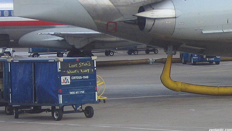 I was pretty weirded out to see that the baggage carts all had “Love Stinks, Wright is Right” written on them. I pointed it out to Rachel, thinking maybe we were seeing some strange lover's quarrel of airline workers, but she told me it was actually about Dallas Love Field and the Wright Ammendment (more) or something else that went over my head. |