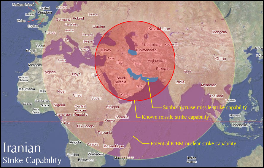 So it looks like Iran is fastlining to nukes. You may remember from past posts that they have delivery systems (ICBMs with about a 6,000 km range developed with North Korea, Mach III Sunburn cruise missiles from China), complete documentation on building nuclear weapons (care of Pakistan), a trigger mechanism (400 tons of high explosives obtained from Iraqi sites unsecured thanks to the US invation), and nuclear fuel that's currently being enriched in centrifuges… So they could be within six months of having nuclear capability across the range pictured below.