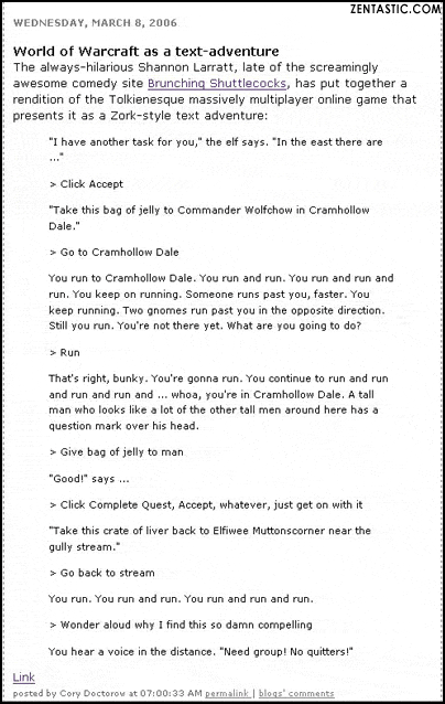 "Cory Doctorow: The always-hilarious Shannon Larratt, late of the screamingly awesome comedy site Brunching Shuttlecocks, has put together a rendition of the Tolkienesque massively multiplayer online game that presents it as a Zork-style text adventure."