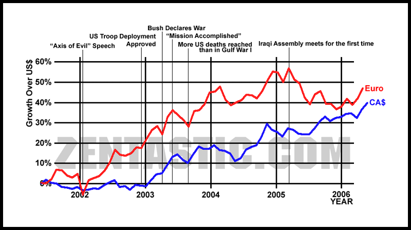 After 911, the US dollar stayed strong, until the “Axis of Evil” speech at which point the Euro started to climb over the US, although the Canadian dollar stayed even… but then the US sent troops to Iraq, and the US dollar began to drop against both the Euro and the Canadian. It rebounded temporarily after the “Mission Accomplished” speech, but started to decline steadily as the troops deaths increased. After the Iraqi Assembly got elected, it rebounded temporarily against the Euro, but not against the Canadian dollar.