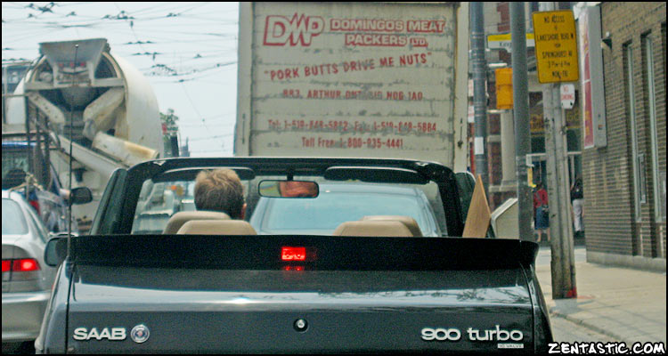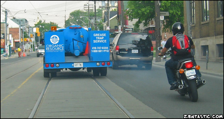 This poor biker kept getting hit by belches of smoke from the truck owned by the ironically named “Organic Resource” grease trap service company (for search engines: Toronto, Ontario, Canada; 416-747-6584, 1-800-661-4513). It smelled terrible.