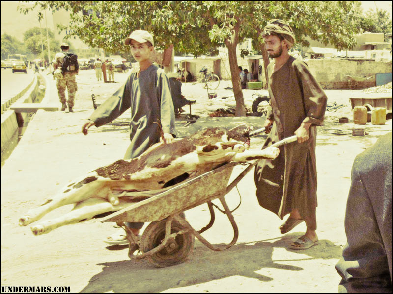 I think this is one of my favorite photos that I've gotten for Under Mars. If you'd like to see a closeup, here's one of the guys carrying the dead cow and one of the old guy in the foreground. The picture was taken in Kabul, Afghanistan while Multi 6 from 16 Signal Regiment (I admit I don't know exactly what that means, sorry).