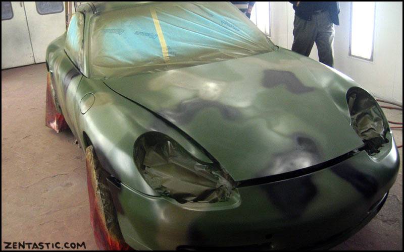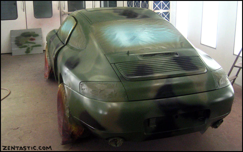 Camo Porsche: I stopped by the paint shop and was met there by a pile of experts… The shop had been talking to the paint manufacturer and they were pretty excited about the project and sent down their top guys to make sure the job went perfectly because they want to showcase it in their catalog. The car is currently matte black and the green and tan camo tones are going on as I write this.