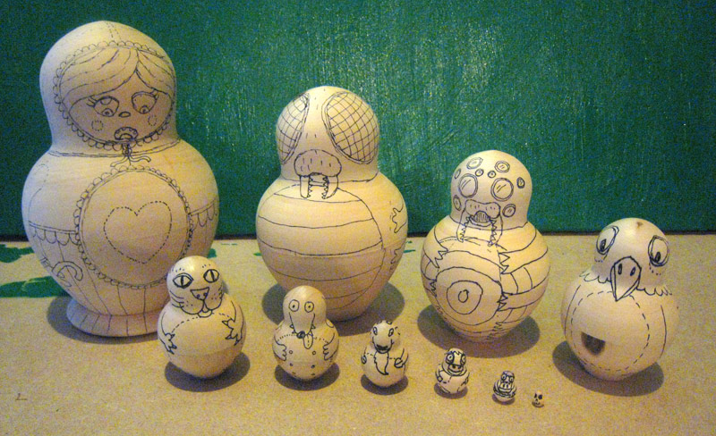 I will post these again when they’re finished, but I started today on my Russian nesting doll project (after about a month of nervously wondering whether my order from Russia would actually arrive). It’s a ten part set based on “I know an Old Lady“, put together in the order of the song so it can be sung as the set is disassembled. Here’s a shot of my sketches for it —