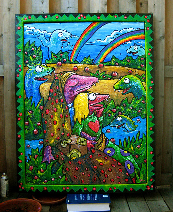 I’ve nearly finished my latest painting. It needs a few minor changes and then just framing. It’s called “The Blind Lizard”, an homage to Millias’s classic painting “The Blind Girl“. In it, all the animals marvel in glee at the spectacle and beauty of the double rainbow, with the exception of the blind lizard who can’t see the rainbows. She can however experience the beauty of the sensation of simply being alive; the feeling of the fresh air after the rain, the sun on her face, and the sounds and sensations around her.