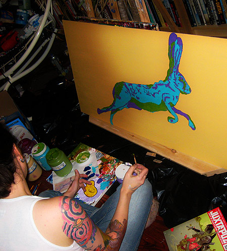 I love the rabbit! The owl painting as well, but I have a soft spot for rabbits. I love the colors. :)