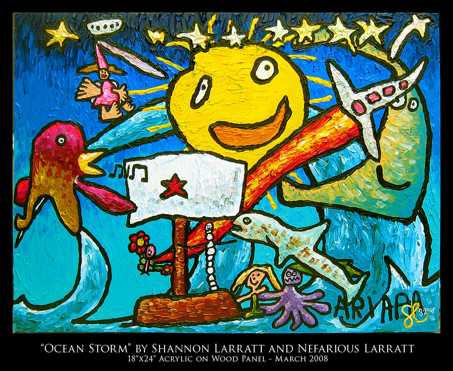 I finished “Ocean Storm”, drawn by Nefarious and painted by me. It’s a very wavy ocean, and in the sky is a band of stars and the sun and moon. A rocket is blasting off, en route to the space station. In the sky is also a “princess angel” as well as a singing bird, and a butterfly carrying two flowers. In the ocean is a sailboat with a star on the sail being captained by the world’s tallest snowman, with evil Ursula and the Little Mermaid swimming nearby as a shark jumps over them. Anyway, you can click it to zoom in.