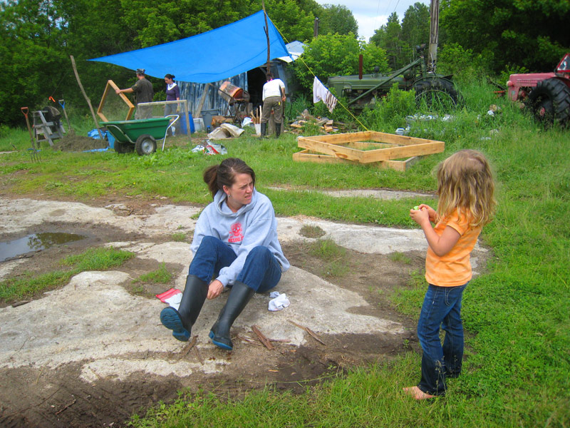 1. Caitlin putting on her boots getting ready for the first day of work. In the background is part of the operation getting the cob mixture prepared. The big frames are for the two large windows in the new building.