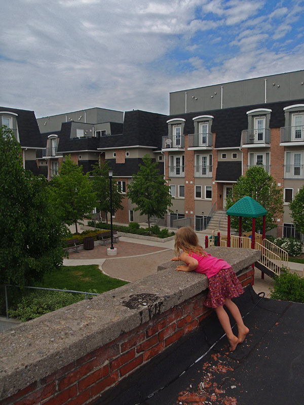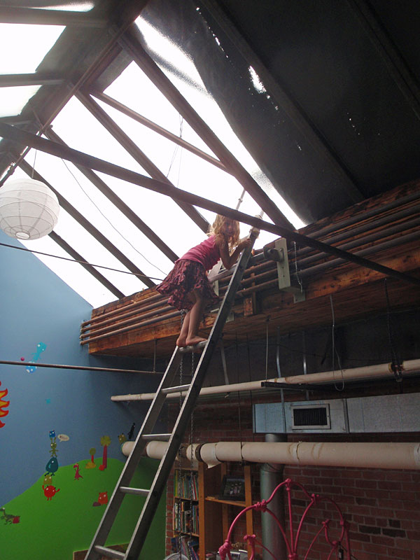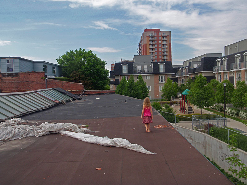 Then today we ate sushi on the beach and played with the boat — as I’ve already blogged at length — and when we got back home I finally took Nefarious up on the roof as I’ve been promising her for a while. I love having roof access, even if it involves an unfinished surface, a trip-inducing maze of stolen cable TV wires, and a treacherous (for someone as wide as me anyway) climb up through a skylight, which today tore a hole in the ass of my favourite shorts. Not that this will stop me from wearing them… There’s something serene about roofs. Then Nefarious went and watched some more martial arts training, and another friend came over to hang out for the rest of the day and lasagna.