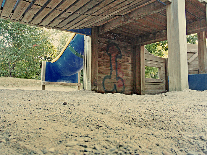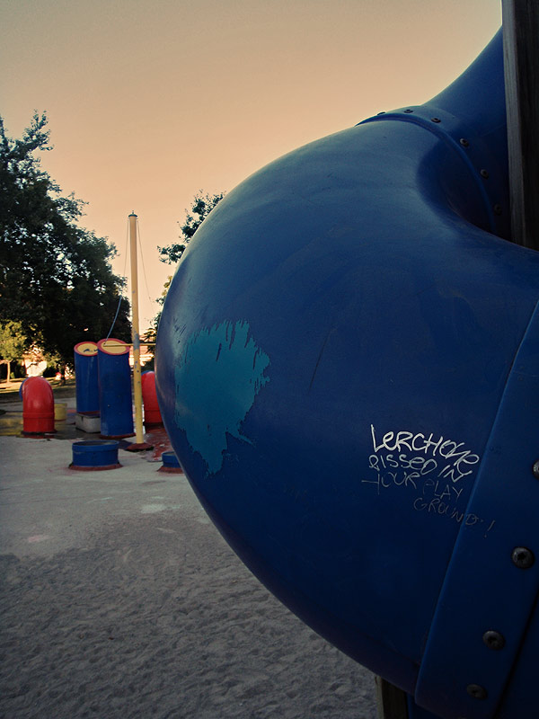 There’s lots more as well, and I didn’t take many pictures so I can’t bore you with more. We also headed to the park (and “enjoyed” the vulgar graffiti and equally vulgar tagging). If you take a look at the picture below, you’ll see there’s a red “chimney” as part of the play structure. Somehow — it would have been quite a feat to throw it so far — someone managed to chuck a bike up through the top of it! Bullies I suppose made some kid very sad.
