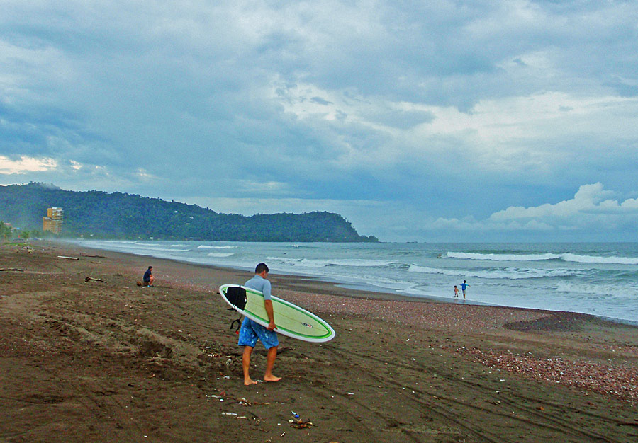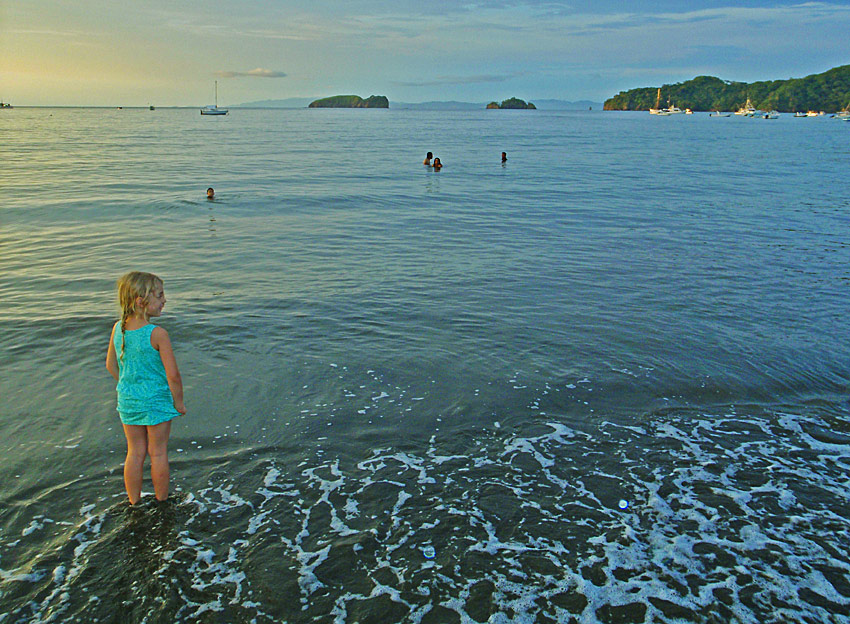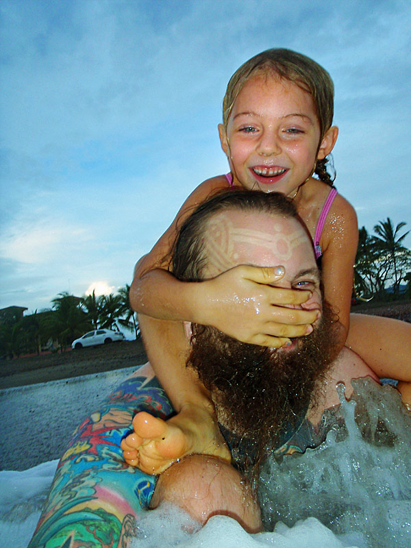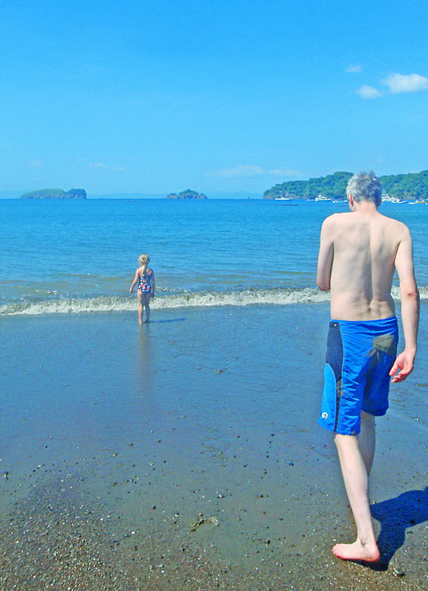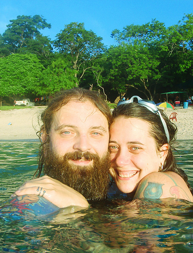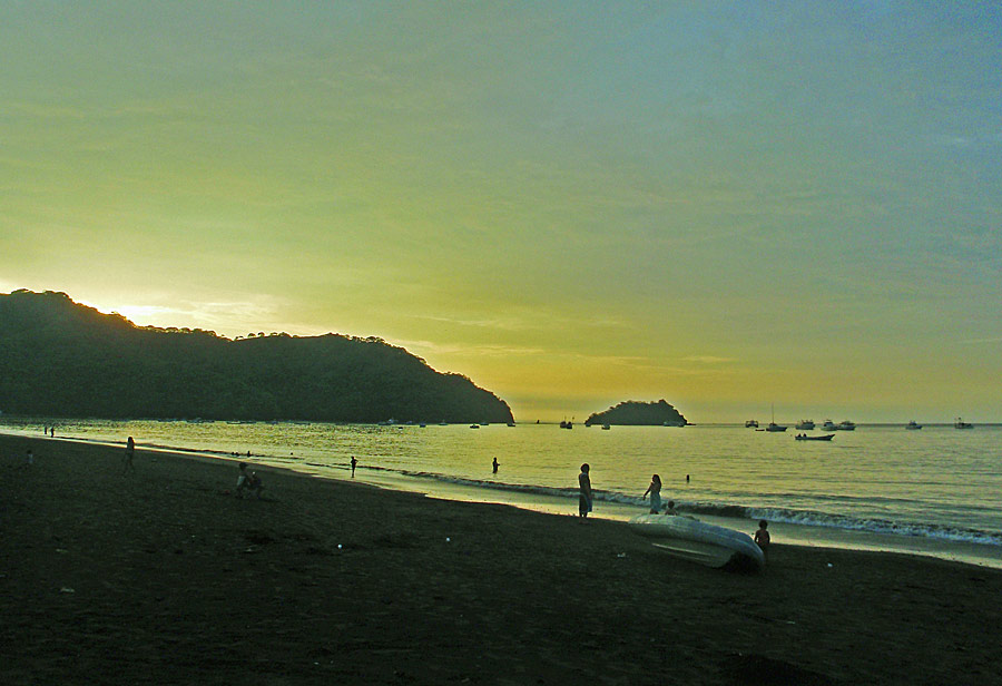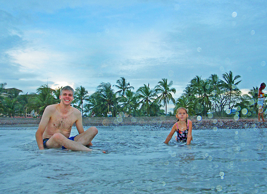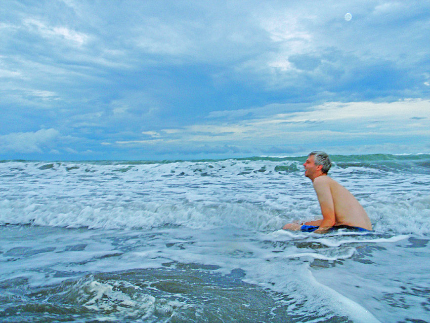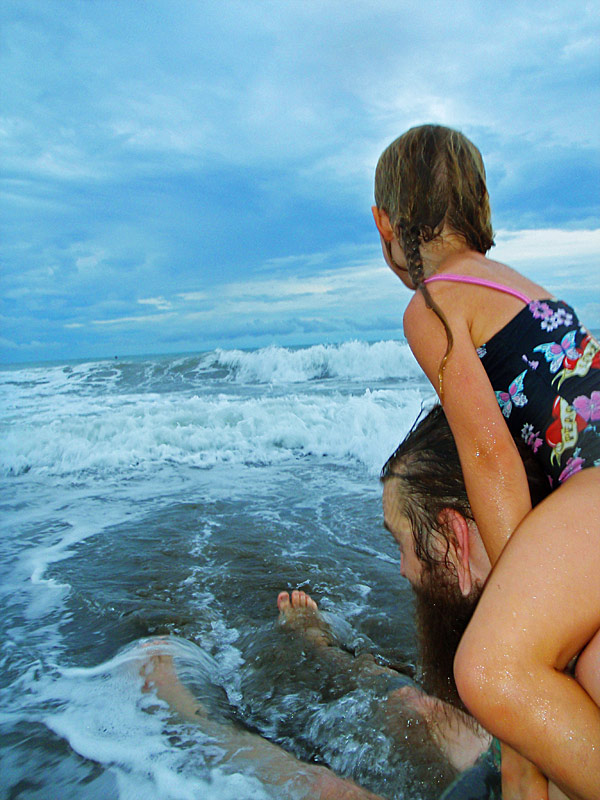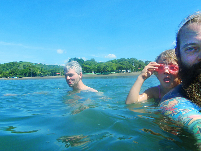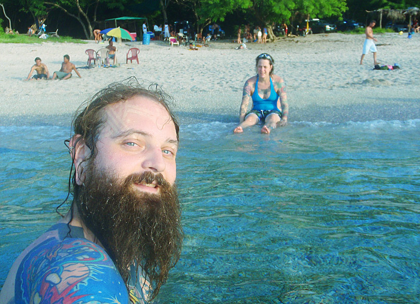 After getting back to the car we drove down to Playa Jaco and ate supper on the beach — ceviche for me, fish tacos for Caitlin, quesadillas for Nefarious, and calamari for David — while we watched surfers out on the waves and naked little kids splashing at the shore as their parents sat and ensured they weren’t dragged out by the deceptively strong current. When we finished eating, I “locked” my glasses in my trunks’ velcro pocket, and we went out into the waves ourselves, being pushed and dragged about by the huge surf. Again, gales of laughter and joy, even with the many scrapes we were suffering and the sand that was quickly and uncomfortably filling our bathing suits.