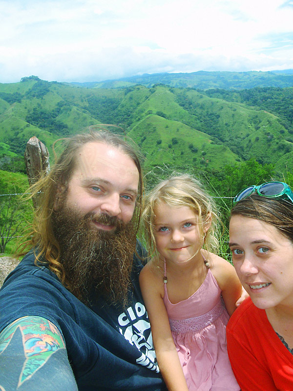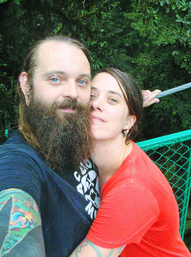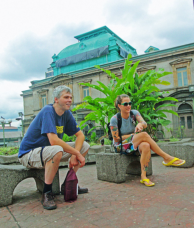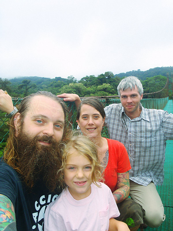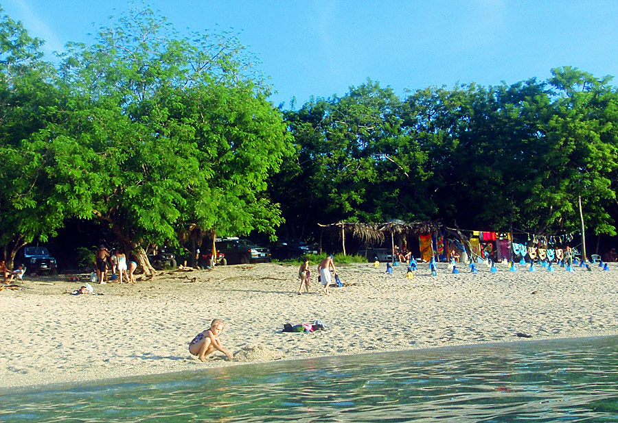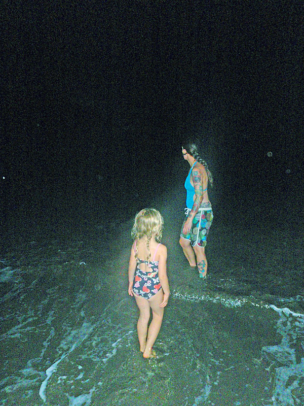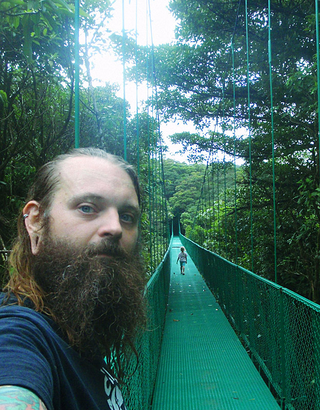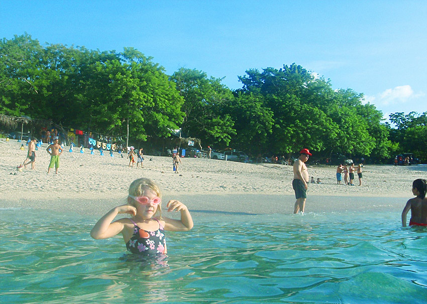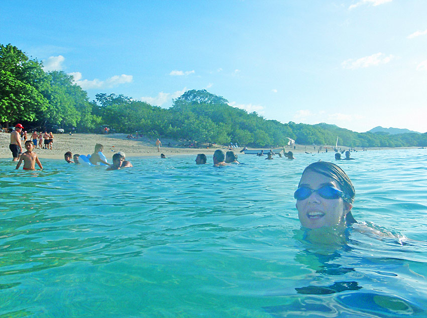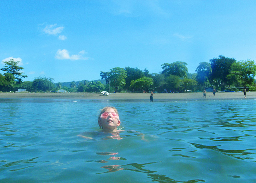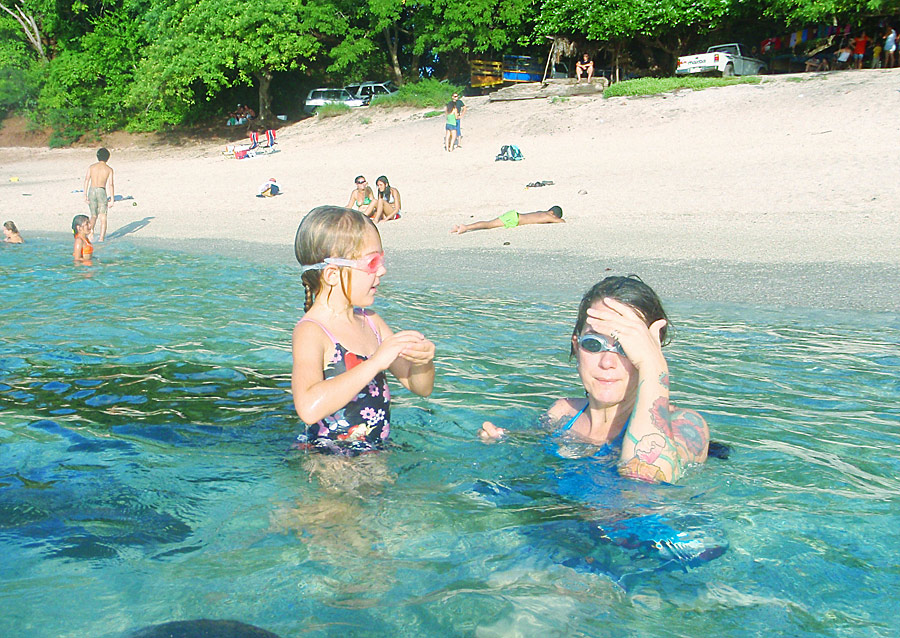 After getting back to the car we drove down to Playa Jaco and ate supper on the beach — ceviche for me, fish tacos for Caitlin, quesadillas for Nefarious, and calamari for David — while we watched surfers out on the waves and naked little kids splashing at the shore as their parents sat and ensured they weren’t dragged out by the deceptively strong current. When we finished eating, I “locked” my glasses in my trunks’ velcro pocket, and we went out into the waves ourselves, being pushed and dragged about by the huge surf. Again, gales of laughter and joy, even with the many scrapes we were suffering and the sand that was quickly and uncomfortably filling our bathing suits.