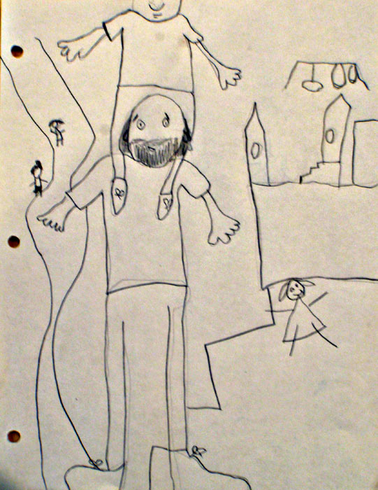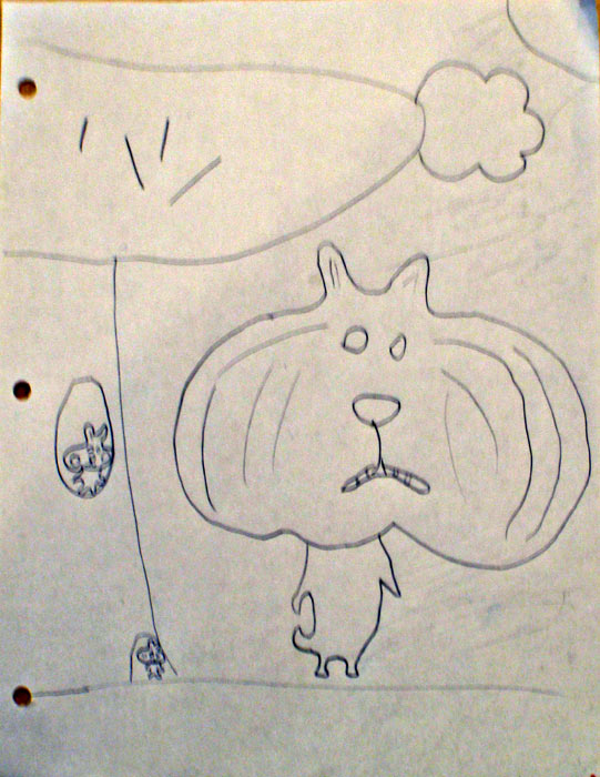 I dug up my projector this afternoon and took Nefarious’s drawing of the chipmunk and blew it up to a full size board, and Nefarious wanted to try it out as well, so she drew a picture of some dragons, had me shrink it down on the computer so it fit under the projector, and then used the projector to transfer it onto a sheet of plywood. Yes, it could have just been drawn right onto the wood, but where would have been the fun in that? Tomorrow morning we’re going to paint them together…