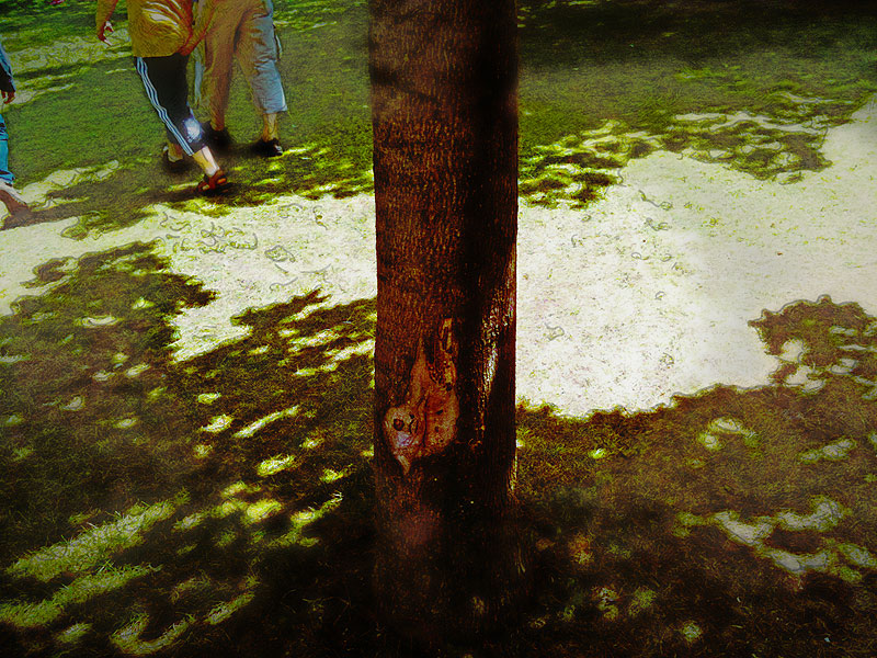 Seeing as I’ve blogged about it anually (we were there last year, 2009, and a few times in 2008, and also in 2007 and every year since Nefarious and I have been back in Toronto — and probably even before that, when she was just a baby), I’m guessing it’s no shock that we were at the CNE today, marching around, mostly chaperoning Nefarious on the fairground rides and games. The day however began with a tree that had a “scar” on the bark that looked an aweful lot like a bird…