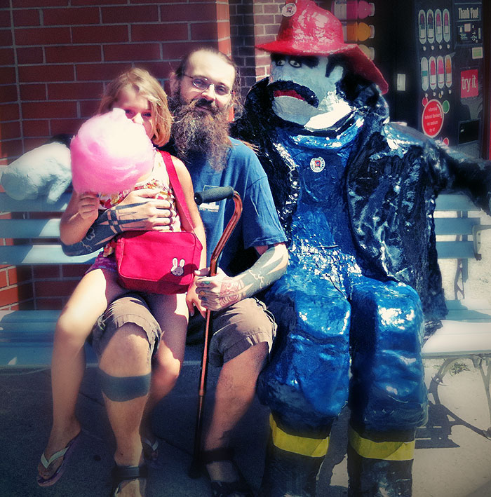 After that, I sat with Nefarious and Caitlin for pictures next to the fire station (but not with Dave, who also joined the three of us), where Nefarious chatted up the fireman, got a sticker (the same sticker that she’s eagerly gotten every year I think), and climbed through a fire engine.