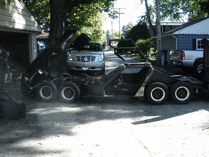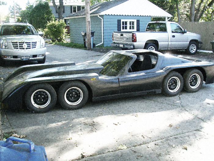 It’s an eight-wheeled Corvette-sort-of-thing, with a double GM front and a double Jaguar rear. The start of a custom interior (including LED gauges) is installed, and the lengthy gull-wing-door fiberglass body looks fairly complete. The engine is totally nuts, made up of a pair of Mazda twin rotary engines put together into a single mega-engine managed by four MSD ignitions. I have no idea how close to running it is, but seriously, what a kooky and inspiring project. This is the kind of crazy backyard engineering that makes up for the stupid shit in the previous entry and makes me love America again. I can’t imagine how much fun that would be to drive around. Holy head turner. Anyway, I’m done now.