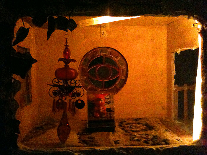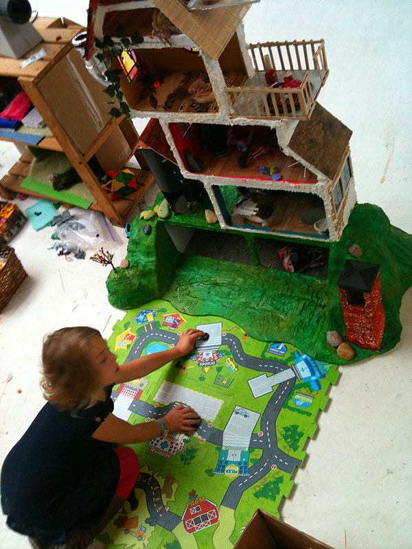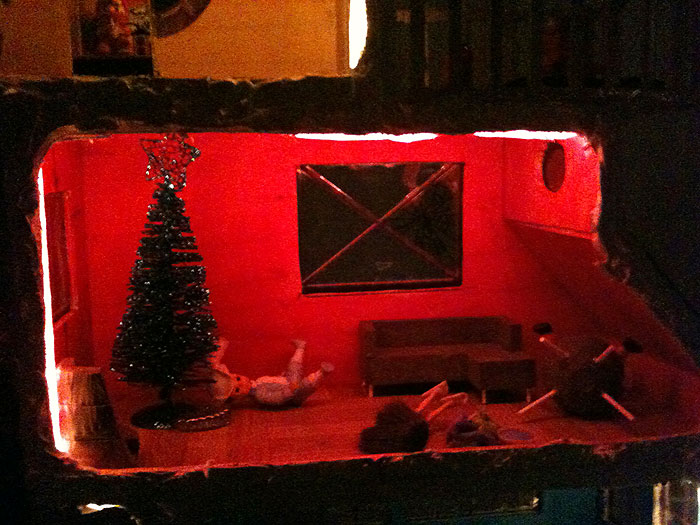 Nefarious went to the toy store to spend some of her savings and got one of those foam puzzle mats (with a printed car track) and it fits perfectly in front of the doll house. Following are a couple of night time pictures of the house that I quite like. As you might notice, we’ve slowly been adding furniture and so on, and various decorations, including some for the Christmas holidays.