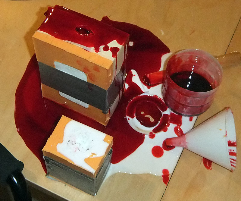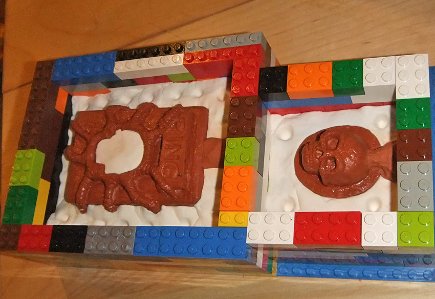 Now here are a few photos of the construction stages (Nefarious helped me make the mold boxes out of Lego — we’re going to try replicating a doll she made in foam later tonight, which I’m quite eagerly looking forward to as I’ve never cast expanding foam before. And, yes I made a mess with my new materials. As you can see I can now cast coloured plastic and do effects like the silver plating (which was done by brushing silver powder into the mold so it bonds to the outer layer of the plastic. The table cleaned off fine, but my fingers are ridiculously stained. Quality-wise I’m quite proud of this mold.