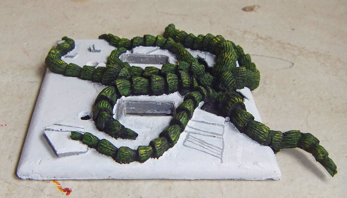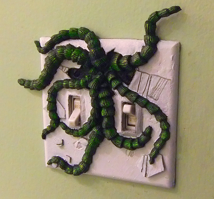 I also finally made the mold for my new light switch design for double switches, and then painted it using the Vallejo paints. The tentacles are textured with ridges so it was really easy to get a pretty nice paint job by dry brushing it. The plastic I used was an ultra hard “onyx” black polymer, so it took a few coats of white and looks a little amateur. In a more motivated perfect world I think I’d cast the tentacles and the shattered switchplate as separate pieces so that I could cast each with its own colour.