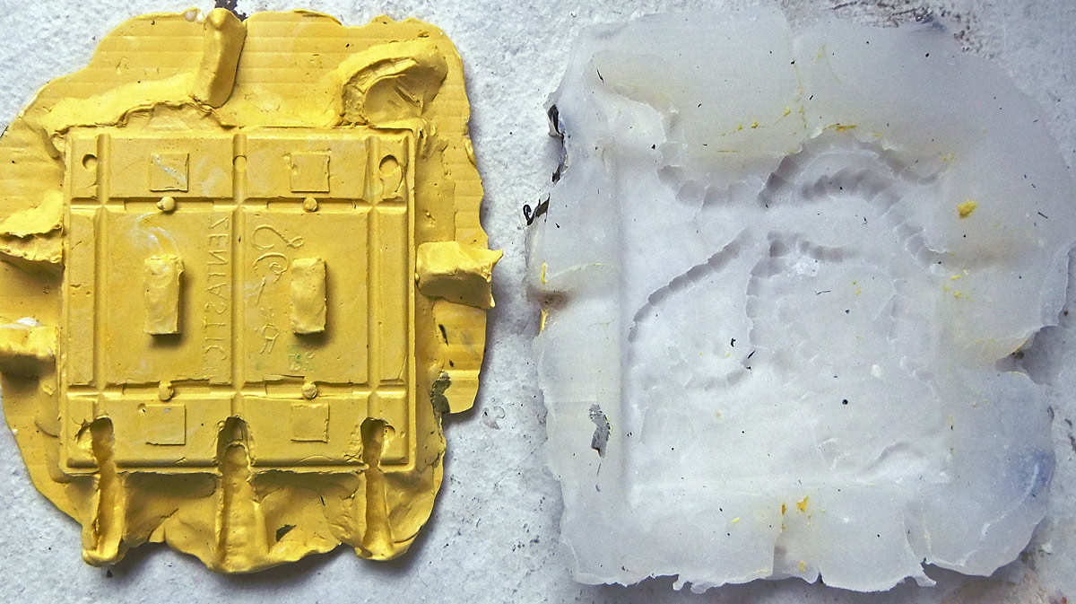 I made this ages ago but only recently made the mold. For some reason it was a bit of a pain to cast, but since the mold is “deep” in design, with the front face sitting in a fairly indented hole, in the end it was actually easier to just pour a bunch of plastic into the clear half and then as it started to harden pushing the back half (the yellow part) into it. I suppose that using that method I could have done without the spouts, so I’m going to keep that in mind for the future.