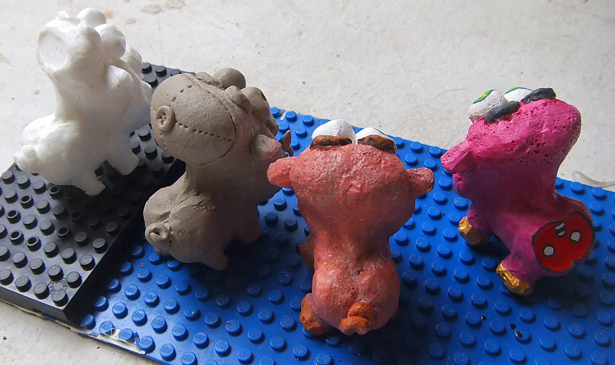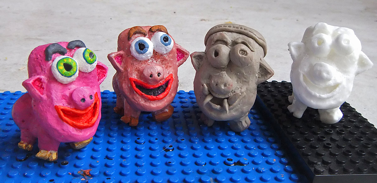 I wanted to update with the latest mold making that’s been going on here. First of all, I finally made a mold of Nefarious’s creation “Tippy Pig”, who as I’ve mentioned before got his name due to his large head which regularly causes him to tip forward. On the left are two painted examples, cast in two slightly different plastic polymers, and painted with two different kinds of paint (Citadel and Vallejo) because I’ve been trying to figure out which paint works best on these plastics. Paint does not stick too well without a primer (and on these it’s made worse because there seem to have been quite a few bubbles — I’d love to get a vacuum chamber set up but it’s costly). The white pig is unpainted plastic, and the gray pig is an experiment in casting it using Apoxie Clay, which is a two part clay that hardens to rock-hard over a few hours without cooking. I like it a lot, and also got some similar Milliput clay that I still have to try, and although it’s intended for modeling, it did work nicely in the mold as well. After it hardened, I also experimented with adding a few changes, also using the clay, including tusks, a hat, and a big belly. Another reason I like working with it is that it’s completely bulletproof, unlike Sculpey, which I normally use, which can easily break when you’re working on it as it’s so fragile.