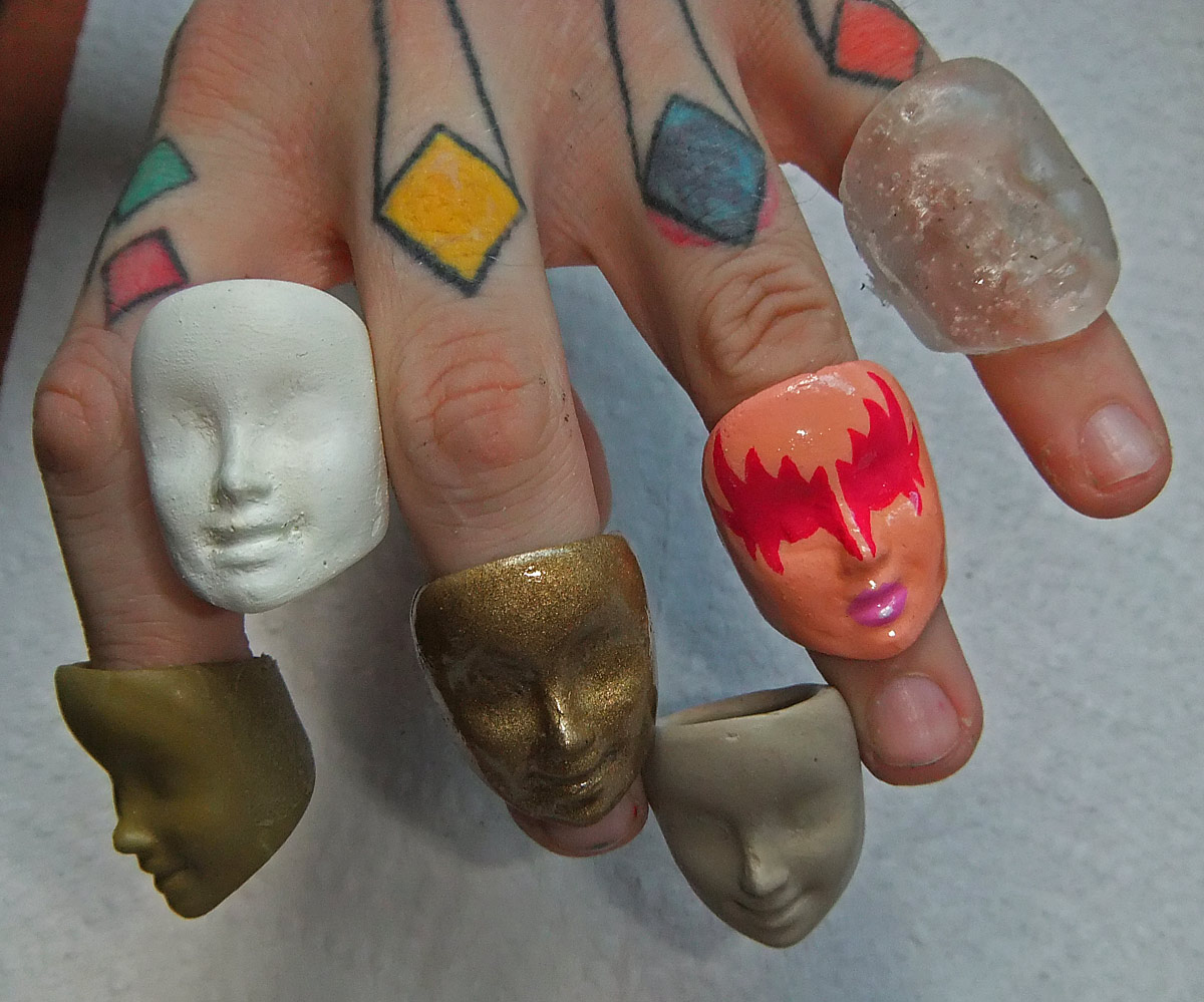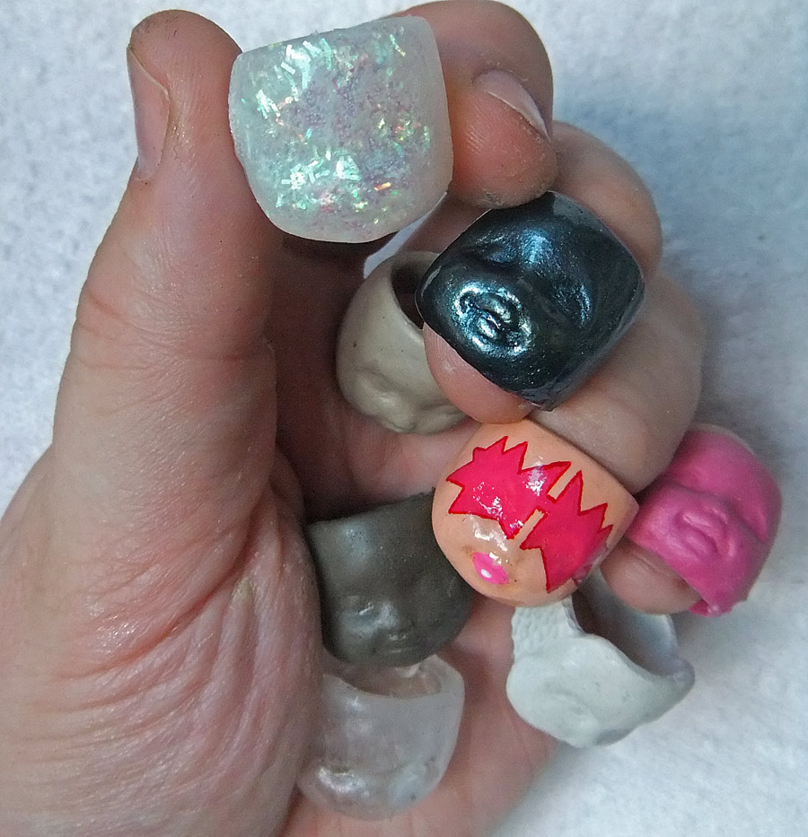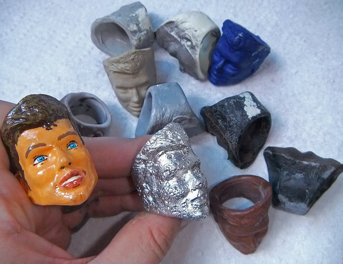 I’ve mentioned a few times that I’ve started working on jewelry, so let me finally get around to posting some pictures to show you how that’s going so far. I’m sure you’ve noticed before that I made some molds of doll faces that I’ve integrated into things like the bowls I just posted. I also decided to make some rings out of them, in the style of skull rings, but with the flesh and skin still in place. I have some other ones started, but so far I have completed three — a guy, a girl, and a baby. Big, medium, small. A Goldilocks set? Much of what I’ve been doing is experimenting with different plastics and finishes as well as working on making convenient and high quality, easy-to-use molds. All of these were made with three-part silicone molds. In between parts I pressed Lego blocks into the silicone pre-curing so that they fit together quite snugly.