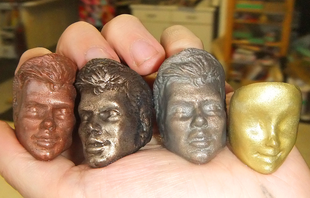 Enough waawaawaaaaa whining though. Check out the rings — from left to right the materials are, I think, copper, bronze, silver/nickel, and brass. They are mixed roughly two parts plastic to one part metal powder (by volume, not weight), and cast in silicone molds. There is no clear coat or anything like that creating an artificial sheen — this is what came out of the moldl without anything added afterwards. The plastic base is “Amazing” casting resin from Alumilite and the metal powders are from Smooth-On, both of which have been great to work with and I recommend. Click to zoom in if you’d like.